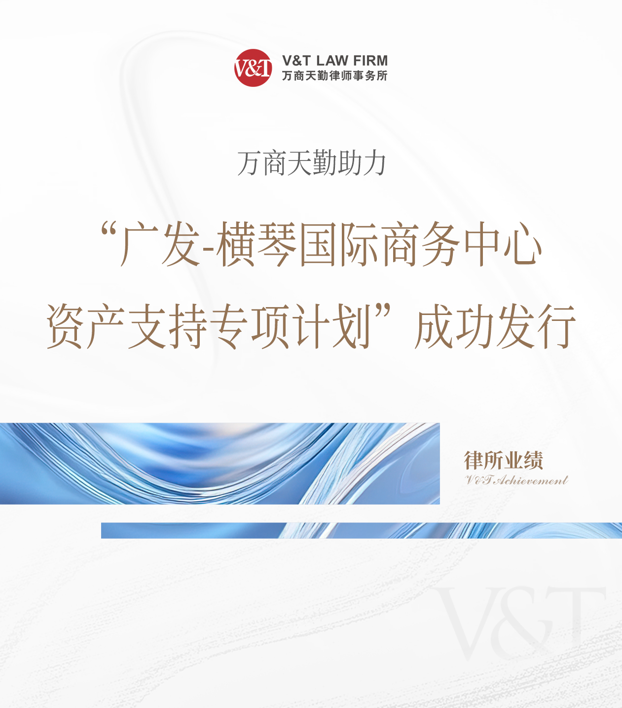 2025年9月17日,由万商天勤担任专项法律顾问的“广发-横琴国际商务中心资产支持专项计划”成功发行。项目发行规模13.51亿元,期限18年(3+3+3+3+3+3),优先级资产支持证券获AAA评级,发行利率2.60%。专项计划管理人为广发证券资产管理(广东)有限公司,原始权益人和增信机构均为珠海大横琴集团有限公司。