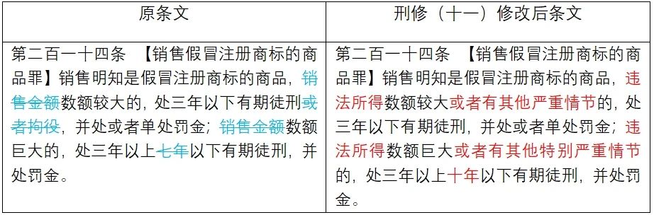 首先,刑修(十一)将该条“销售金额”改为“违法所得”,并不仅仅是为了和第二百一十七条【侵犯著作权罪】用语相统一而采取的同义替换,在两高《关于办理侵犯知识产权刑事案件具体应用法律若干问题的解释》(法释〔2004〕19号,以下简称“2004年《司法解释》”)中对“非法经营数额”、“销售金额”已有明确规定的语境下,立法者再行将“销售金额”修改为“违法所得”,可见“违法所得”应有其独立的涵义,不等同于“销售金额”或“非法经营数额”。